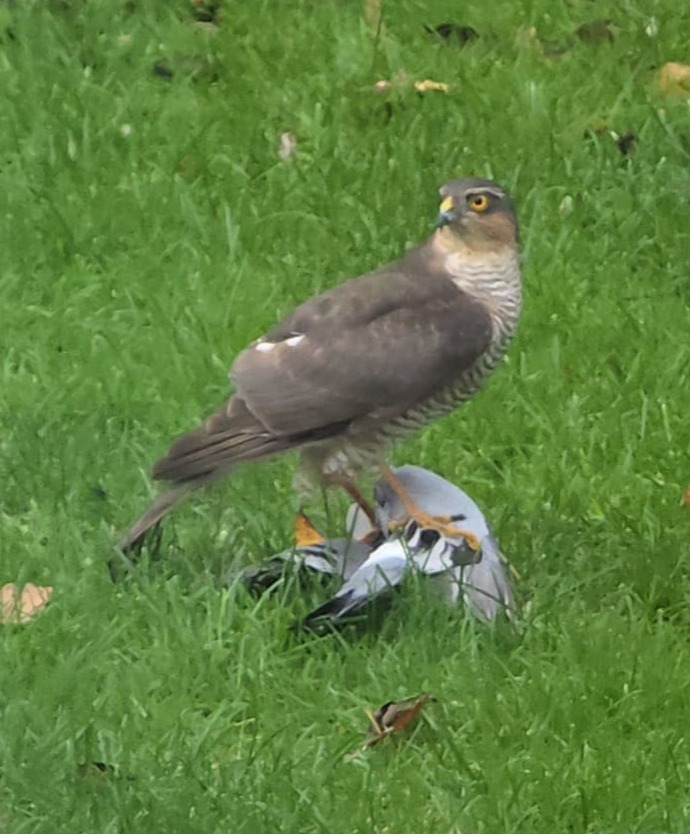 I received a call from someone wanting identification of a brown bird eating a meal on their lawn. Expecting to be sent a photo of a female backbird or possibly a young starling or thrush, I was surprised to see a sparrowhawk tucking into a pigeon!
