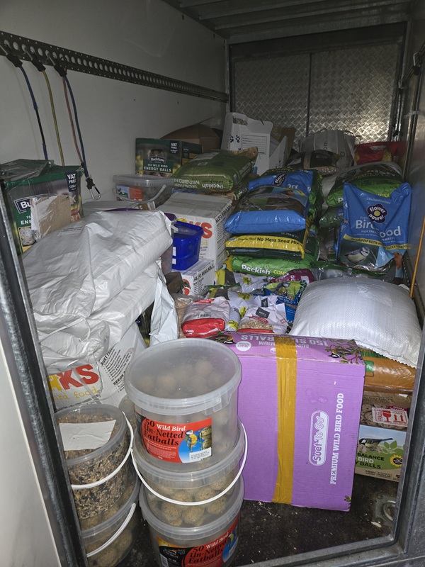 We have fared well this year with our new friends in Trafford, Manchester, who save up all the damaged sacks of food from their shipping contacts, then we will go down and collect; these food donations go on to save quite literally thousands of birds lives, through use on wildlife rescues in Rochdale, Meltham, and Wigton.